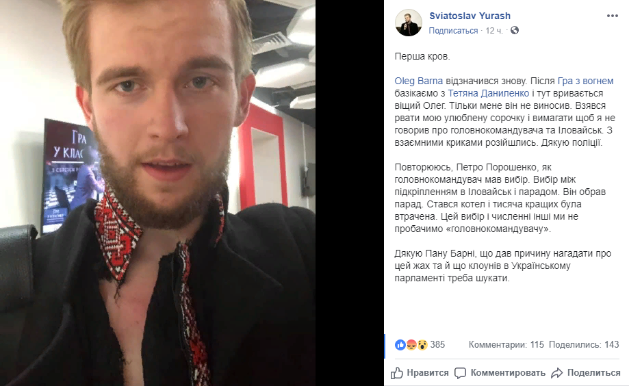 "Первая кровь. Oleg Barna отметился снова. После Игры с огнем болтаем с Татьяной Даниленко и тут врывается вещий Олег. Только меня он не выносил. Принялся рвать мою любимую рубашку и требовать, чтобы я не говорил о главнокомандующем и Иловайске. С взаимными криками разошлись. Спасибо полиции", - пишет на своей странице Святослав Юраш.