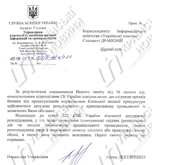 В Службе безопасности Украины сообщили, что данные в уголовном производстве можно разглашать только с письменного разрешения следователя или прокурора и объеме, в котором они признают возможным.