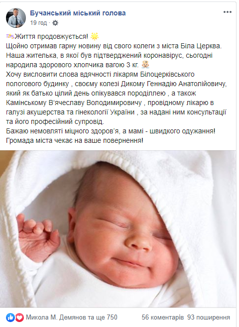 Женщина из города Буча Киевской области, которая болеет коронавирусом, родила 7 апреля здорового мальчика. Об этом на своей странице в Facebook сообщил мэр Бучи Анатолий Федорук.