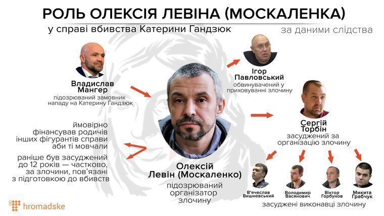 В дальнейшем, по данным следствия, Левин привлек к преступлению другого фигуранта дела – Сергея Торбина, а он нашел исполнителей. В то же время договоренность о нападении проходила во дворе офиса еще одного фигуранта – Игоря Павловского, который, как утверждает следствие, знал о подготовке преступления. Роль Левина подтверждается показаниями других фигурантов, а также данными следствия. Правоохранители считают, что Левин предоставил Торбину 5 тысяч долларов на реализацию нападения на Гандзюк. Когда уже задержали исполнителей, Торбин просил у Левина еще 2 тысячи долларов для того, чтобы сбежать. Тот деньгипредоставил.
