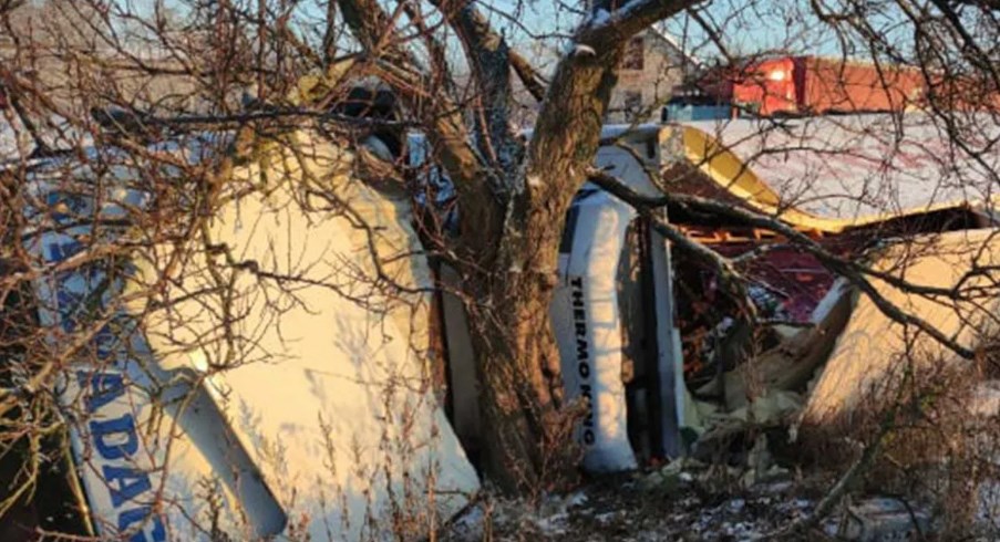 Грузовой автомобиль марки Mercedes съехал с дороги. Впоследствии транспортное средство перевернулось. Кабина фуры чуть не врезалась в дерево. Водитель в результате этого события не пострадал и не получил значительные травмы.