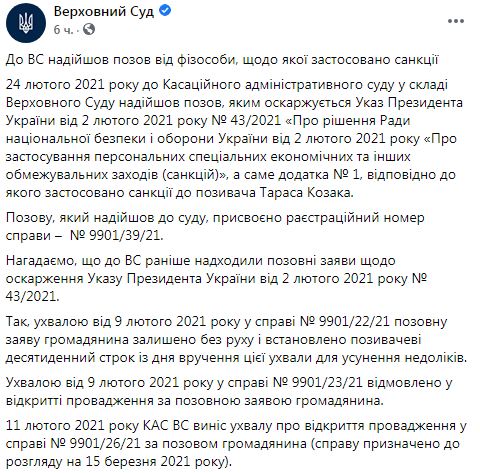 В Кассационного административного суда в составе Верховного суда 24 февраль 2021 года поступил иск от физлица Тараса Козака, в котором он оспаривает решение СНБО, касающееся примененных к нему санкций. Это не первая попытка оспорить решение СНБО в Верховном Суде.