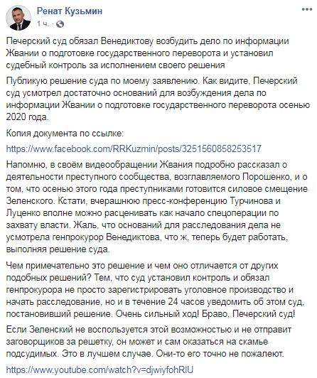 Об этом нардеп сообщил в пятницу, 11 сентября, в Facebook. "Печерский суд обязал Венедиктову возбудить дело по информации Жвании о подготовке государственного переворота и установил судебный контроль за исполнением своего решения", - пишет Кузьмин.