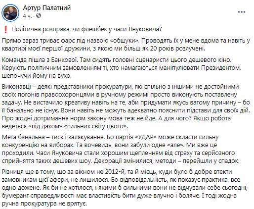 По его мнению, цель этих обысков - давление на него из-за сильной позиции партии УДАР на предстоящих выборах. Такие методы, как написал Артур Палатный, являются повторением сценарного плана команды Януковича.