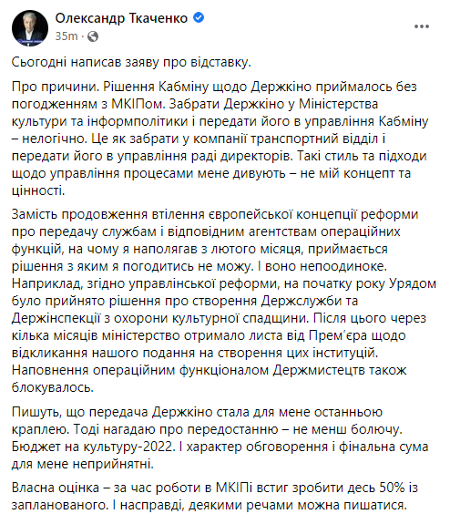 Глава Министерства культуры и информационной политики Украины Александр Ткаченко сообщил, что написал заявление об отставке. Одной из причин решения покинуть пост министра Ткаченко называет передачу Госкино Кабинету Министров Украины.