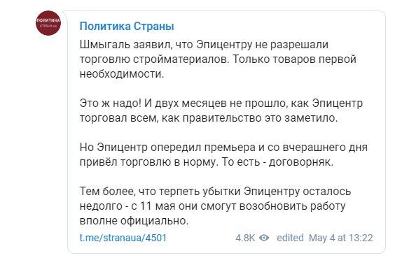 В Telegram канале "Политика Страны" комментируют, что не прошло и двух месяцев с тех пор, как правительство заметил работу "Эпицентра". Однако гипермаркет опередил премьера и привел торговлю в норму.