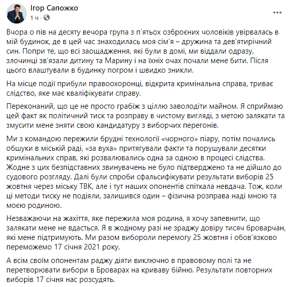 Мэр Броваров Киевской области Игорь Сапожко рассказал, что накануне вечером группа из пяти вооруженных мужчин ворвалась в его дом, где в это время находилась семья - жена и девятилетний сын. Несмотря на то, что все сбережения, которые были в доме, Сапожки отдали сразу, преступники связали ребенка и жену и на их глазах начали бить мэра. После этого устроили в доме погром и сбежали.