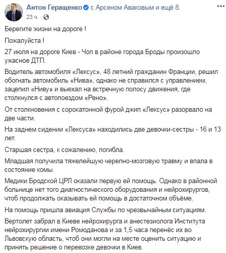 Детали ДТП сообщил заместитель министра внутренних дел Антон Геращенко. По словам чиновника, авария произошла 27 июля.