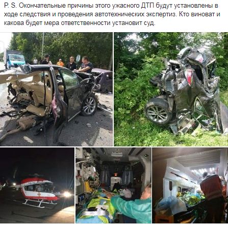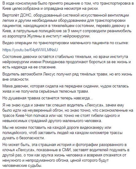 Геращенко сообщил, что во время аварии на заднем сидении "Лексуса" сидели две сестры 13 и 16 лет. В результате аварии старший ребенок погиб, а младшую в коме с тяжелой черепно-мозговой травмой госпитализировали.