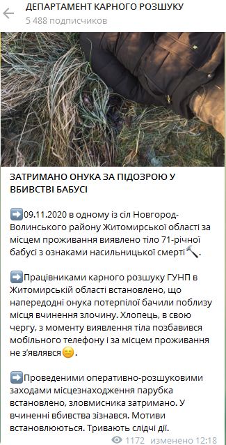 Обстоятельства, которые зафиксировали работники следственно-оперативной группы Новоград-Волынского отдела на месте, однозначно указывали на насильственную смерть пенсионерки. По факту умышленного убийства полицией было начато расследование.