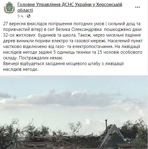 Над Херсонской областью пронесся ураганный ветер, повредив кровли 32 домов и школы
