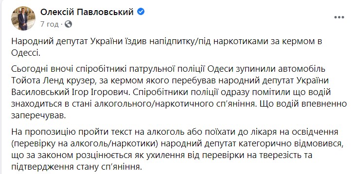 Депутат Верховной Рады Игорь Васильковский улицам Одессы ездил за рулем в нетрезвом состоянии улицам Одессы. Его остановили сотрудники полиции и составили административный протокол.