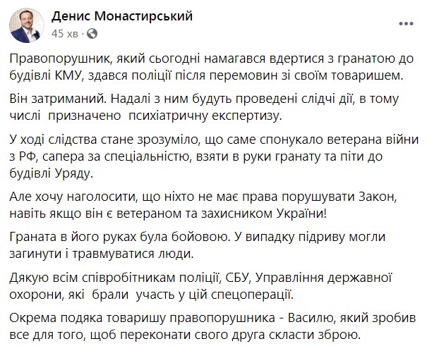 Правонарушитель сдался полиции после переговоров со своим товарищем. Специалисты выяснят, что именно побудило ветерана войны с РФ, сапера по специальности, взять в руки боеприпас и пойти к зданию правительства.