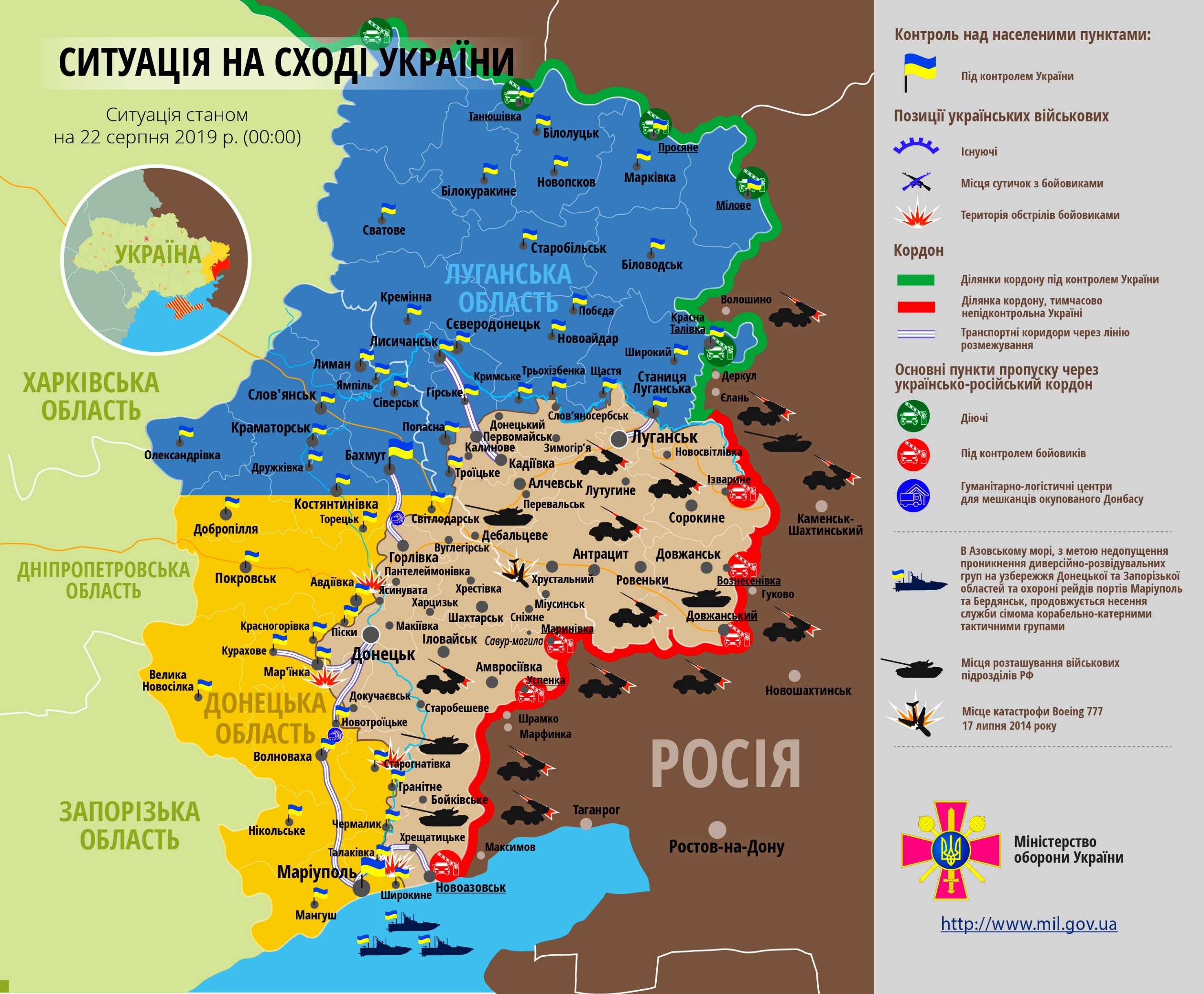 Ранее сообщалось, что оккупанты в зоне проведения операции Объединенных сил продолжают обстрел позиций украинских защитников. Согласно последним сведениям штаба ООС, опубликованным в четверг, 22 августа, боевики незаконных вооруженных формирований 7 раз атаковали с помощью различного оружия наши войска.