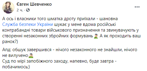 Бывший агент Национального антикоррупционного бюро Евгений Шевченко сообщил, что Служба безопасности Украины ищет у него дома российские контрабандные товары военного назначения и обвиняет в создании незаконных вооруженных формирований. Об обыске сообщил сам Евгений Шевченко на своей странице в Facebook.