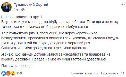 В то же время издание "Украинская правда" сообщило, что с обысками к Тупальскому пришли сотрудники Национального антикоррупционного бюро. Также в издании сообщили, что по их источникам, заместитель начальника Киевской городской таможни ГФС Сергей Тупальский задержан правоохранителями.