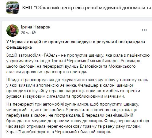Из деталей известно, что "скорая" везла пациентку в Черкасскую городскую больницу №3 под капельницей и в критическом состоянии. Водитель, как положено, включил на машине все знаки оповещения.