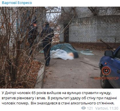 В Днепре 65-летний мужчина, пребывающий в алкогольном опьянении, скончался на улице в результате несчастного случая. Об этом сообщили 24 декабря в Телеграм-канале Вартові еспресо.
