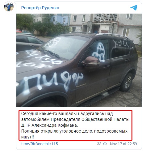 После этого концерт вынуждены были отменить. А сегодня, 18 ноября, кто-то "поблагодарил" пророссийски настроенного Кофмана за заботу о Донецком регионе. Слова, которыми была "украшена" машина террориста мы цитировать не будем, так как они являются "непереводимой игрой слов местного диалекта".