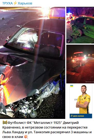 Речь идет о полузащитнике "Металлиста" Дмитрии Кравченко. Авария произошла на перекрестке Льва Ландау и улицы Танкопия.