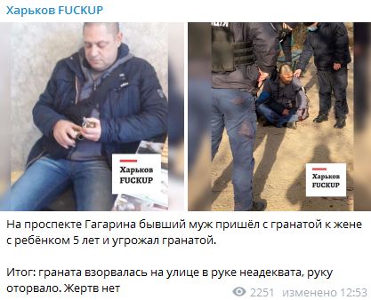 В Нацполиции Харьковской области ASPI news сообщили, что больше в результате инцидента никто не пострадал. Сообщение о взрыве правоохранители получили в 11.46. Наспецлинию "102" звонила женщина, которая сообщила, что в ее квартиру, расположенную на проспекте Гагарина, пришел ее бывший муж и угрожает гранатой. В квартире находится сестра заявительницы и ребенок 5 лет.