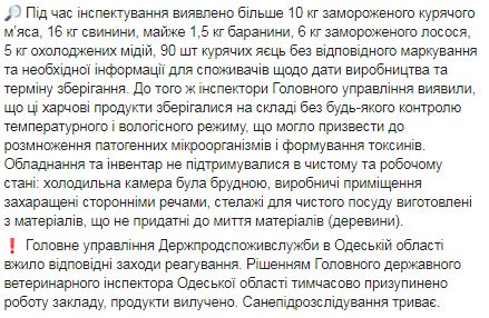 "Холодильная камера была грязной, производственные помещения захламлены посторонними вещами, стеллажи для чистой посуды изготовлены из материалов, не пригодны к мытью материалов (древесины)", - сообщили в ведомстве. Сообщается, что решением Главного государственного ветеринарного инспектора Одесской области приостановлена работа данного заведения, продукты изъяты.