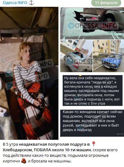 "В 5 утра неадекватная полуголая подруга в Хлебодарском, побила около десяти машин. Скорее всего, под действием каких-то веществ, поднимала огромные кирпичи и бросала на машины", - пишет "Одесса INFO".