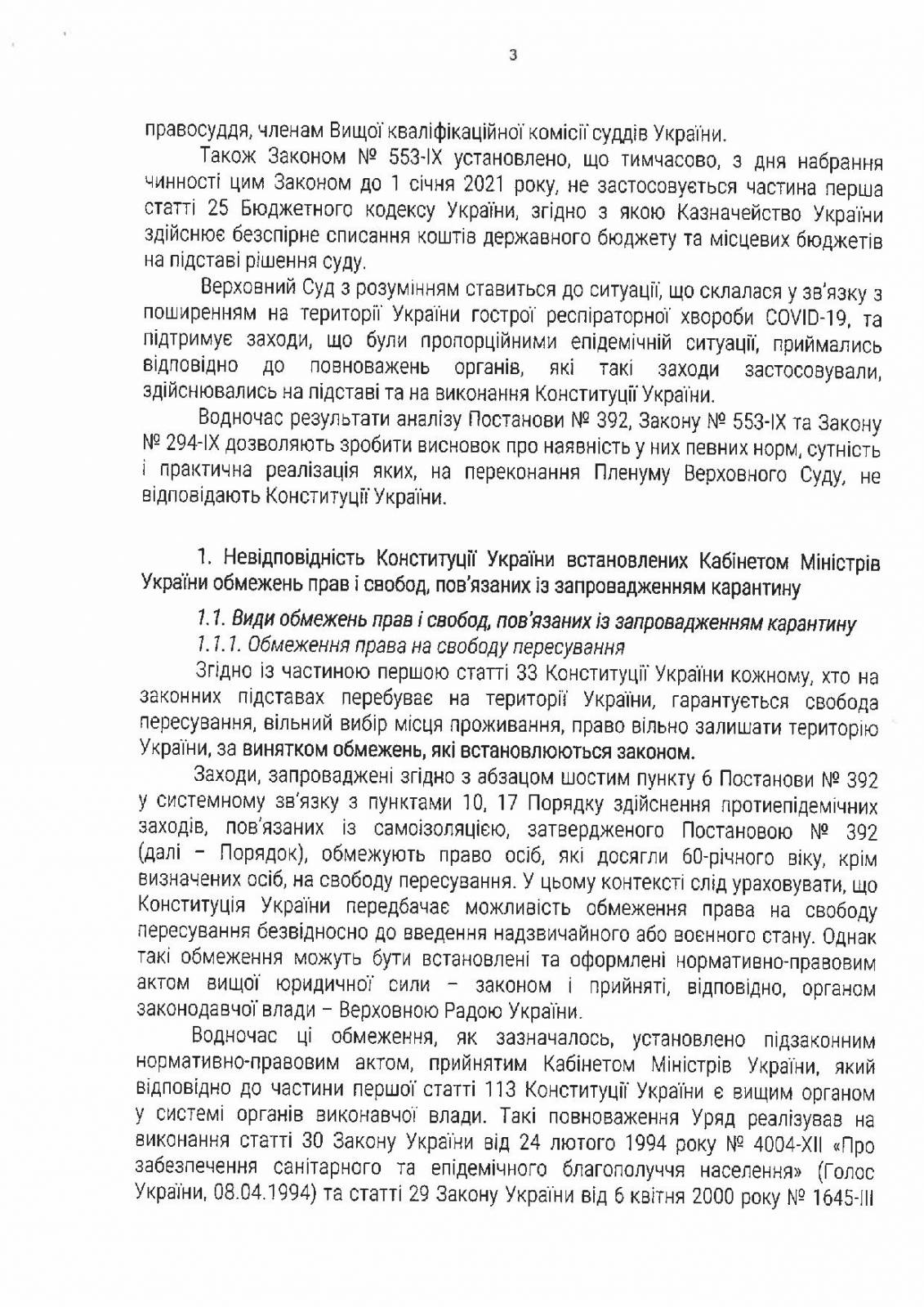 Верховный суд Украины просит КСУ разобраться в соответствии решения о карантине с Конституцией Украины. Речь идет о подпунктах 5, 6, 7, 14 пункта 3, абзаца шестого пункта 6 постановления №392 Кабинета министров Украины "Об установлении карантина с целью предотвращения распространению на территории Украины острой респираторной болезни COVID-19, вызванной коронавирусом SARS-CoV-2, и этапов ослабление противоэпидемических мероприятий" от 20 мая 2020 года.
