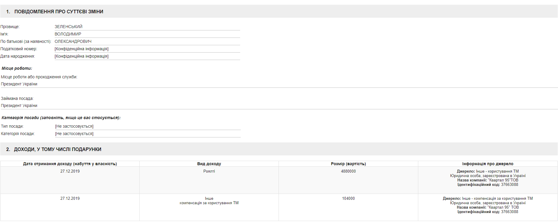В сообщении о существенных изменениях в имущественном состоянии от 3 января Зеленский указал, что получил также 104 000 гривен за пользование торговой маркой.