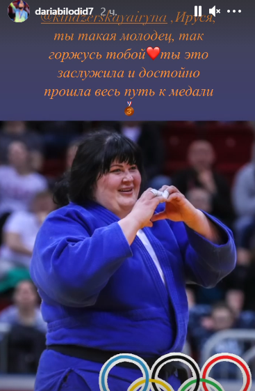 20-летняя украинская дзюдоистка Дарья Белодед, которая завоевала бронзовую медаль в категории до 48 кг поздравила свою подругу, спортсменку из Азербайджана Ирину Киндзерскую (78+) с "бронзой". "Ируся, ты такая молодец. Так горжусь тобой. Ты это заслужила и достойно прошла весь путь к медали", – написала в Дарья Белодед в соцсети. "Я люблю тебя, крошка. Мы это сделали. Горжусь", – ответила Киндзерская Белодед.