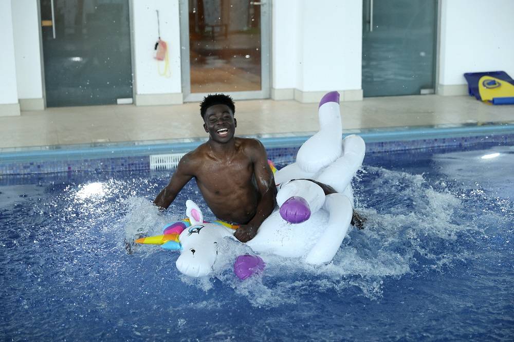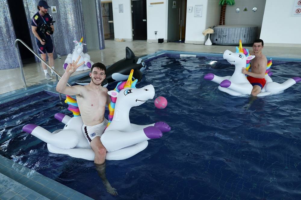 Футболисты сборной Англии решили отпраздновать победу над "желто-синими" в бассейне, где устроили "гонки" на надувных единорогах. Главный тренер сборной Англии Саутгейт выделил своим подопечным выходной, который футболисты провели с пользой. Ребята делились забавными фотографиями в соцсети. Особую активность проявлял Букайо Сака, который играет за "Арсенал". Он придумал новый вид водных развлечений - прыжки с бортика бассейна в воду на единороге.