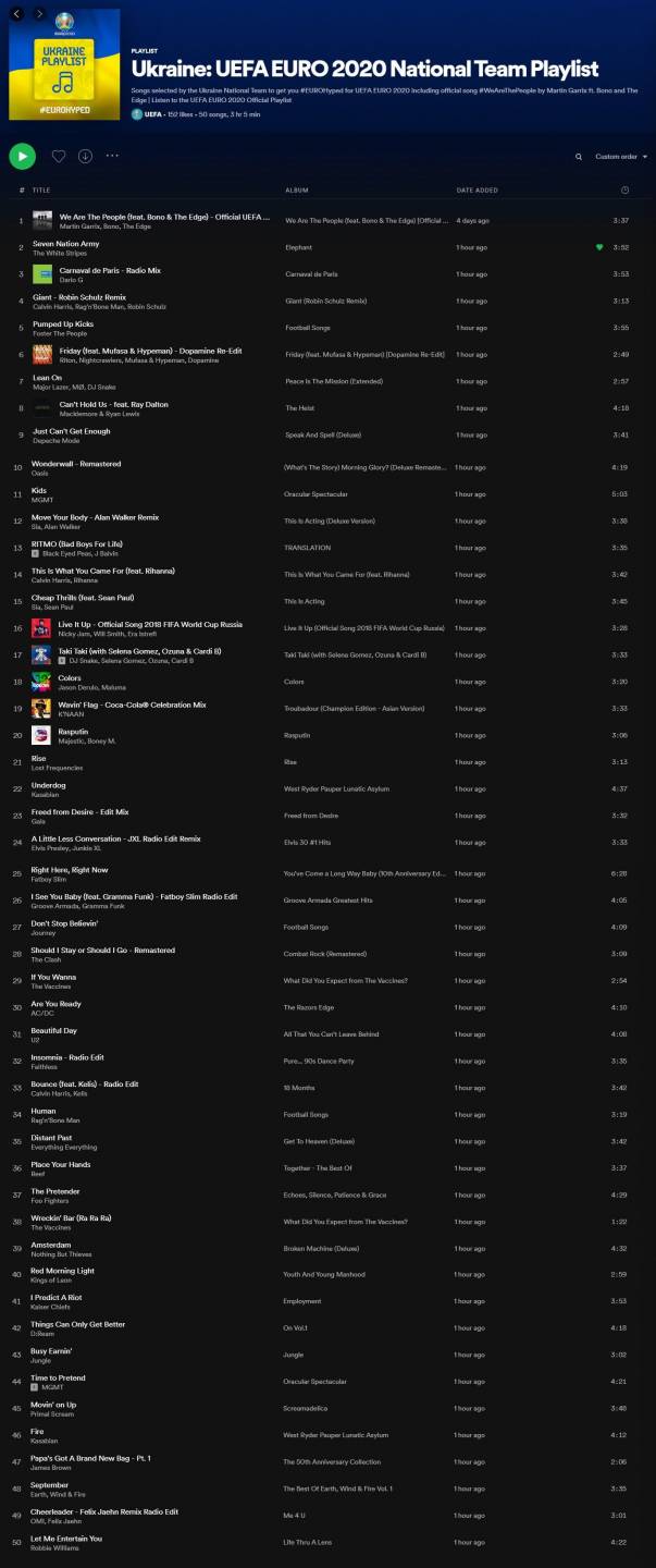 УЕФА, организуя очередной чемпионат Европы, кроме официального гимна на этот раз предложили игрокам команд-участниц сформировать плейлисты своих стран для создания праздничной атмосферы и лучшей коммуникации с фанатами. Сборная Украины составила неоднозначный плейлист.
