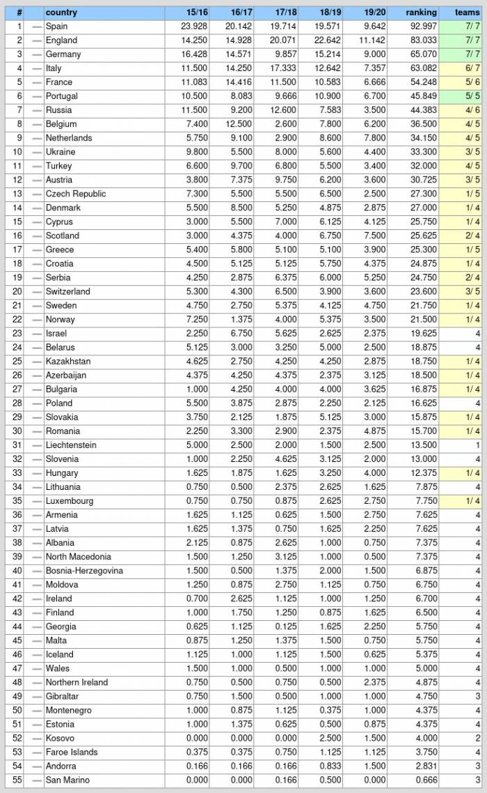 В таблице коэффициентов Украина продолжает удерживать 10-ю позицию, находясь между Нидерландами и Турцией (Бельгия чуть выше на 8-й позиции). "Шахтер" за счет ничейного результата принес украинской федерации 0.200 балла (набранные пункты делятся на 5 клубов), доведя сезонный улов до 4.400.