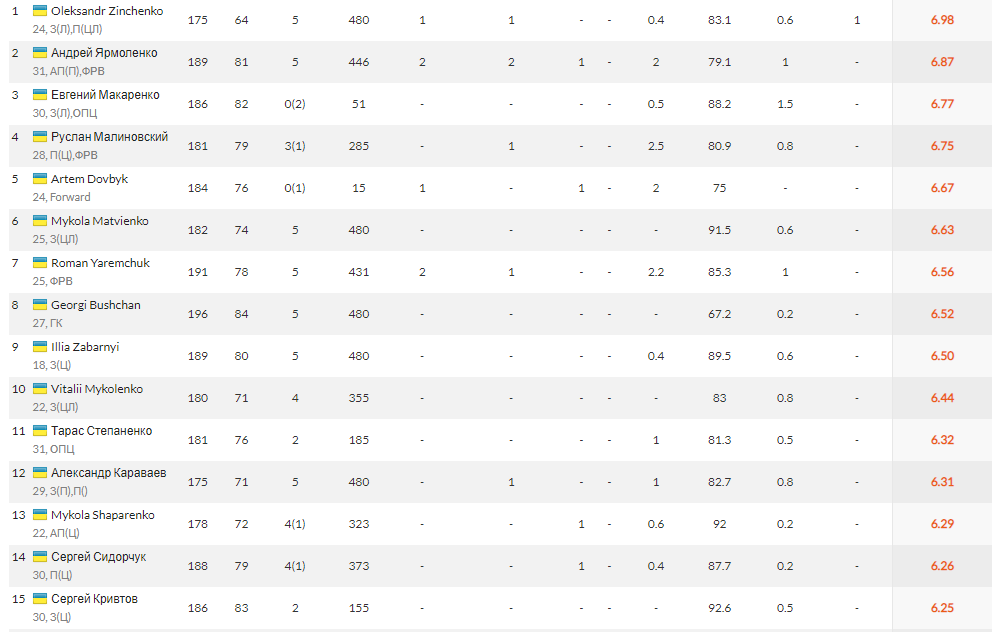 Также в ТОП-5 игроков сборной Украины, по оценкам аналитиков, вошли Андрей Ярмоленко, Евгений Макаренко, Руслан Малиновский и Артем Довбик.