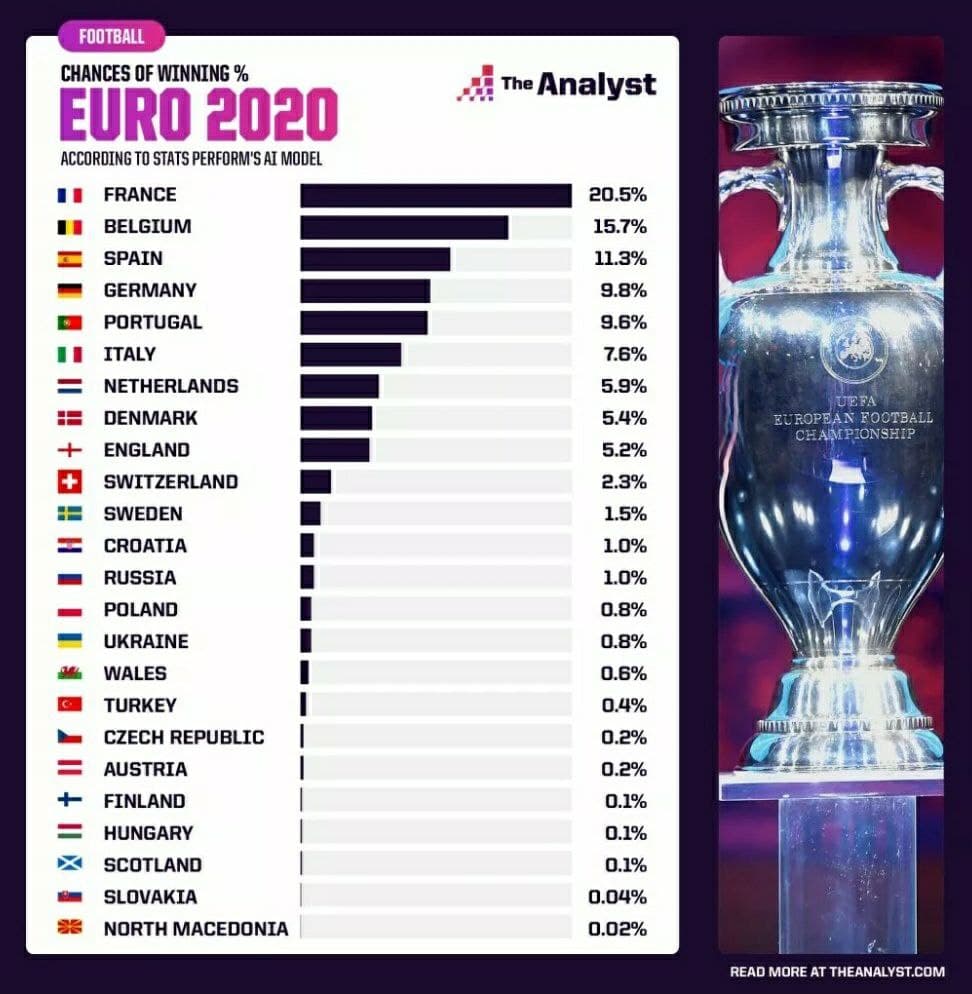 Для расчета система оценивала вероятность результата каждого матча, учитывая ряд статистических данных, в частности, котировки букмекеров. Сейчас украинцы занимают лишь 15-е место среди 24 участников. Больше всего шансов - более 20% - отдают Франции. А также сборным Бельгии и Испании.