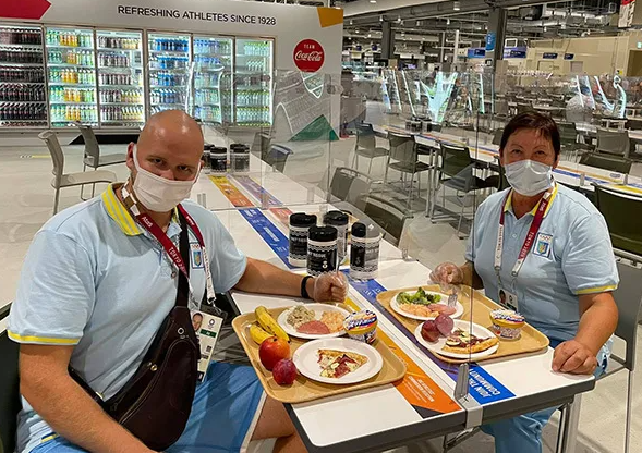 Пресс-служба Национального олимпийского комитета Украины показала фото из столовой. В НОК отметили, что столовая работает круглосуточно. При этом спортсмены едят, сидя друг напротив друга через стеклянную перегородку.