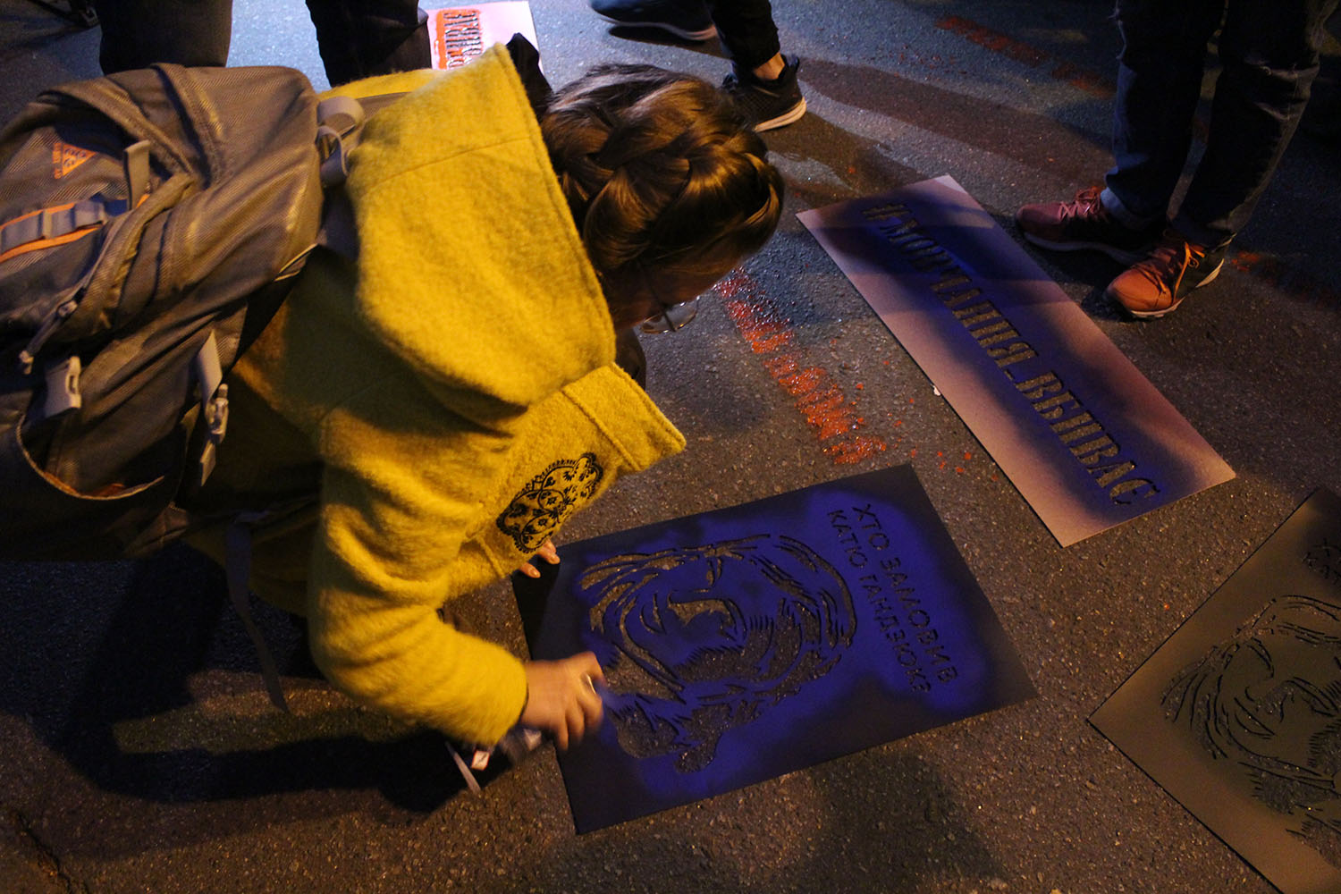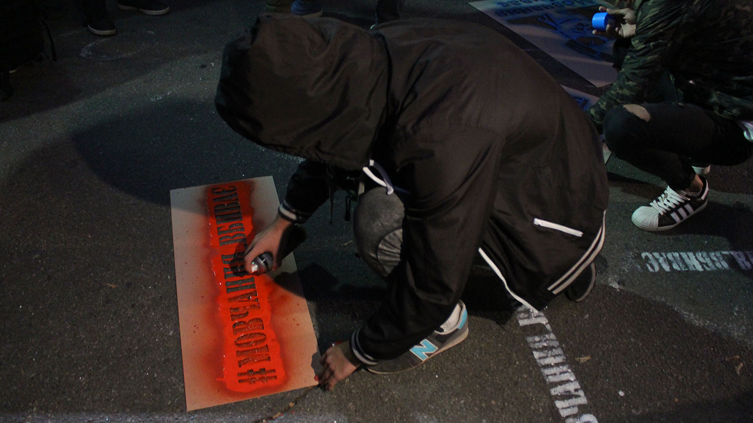 После этого активисты баллончиками с краской расписали асфальт перед въездом на Банковую надписями "Молчание убивает" и "Кто заказал Катю Гандзюк".