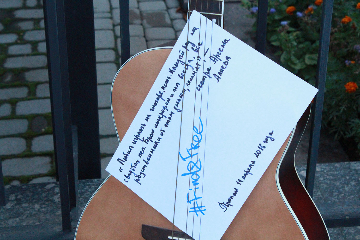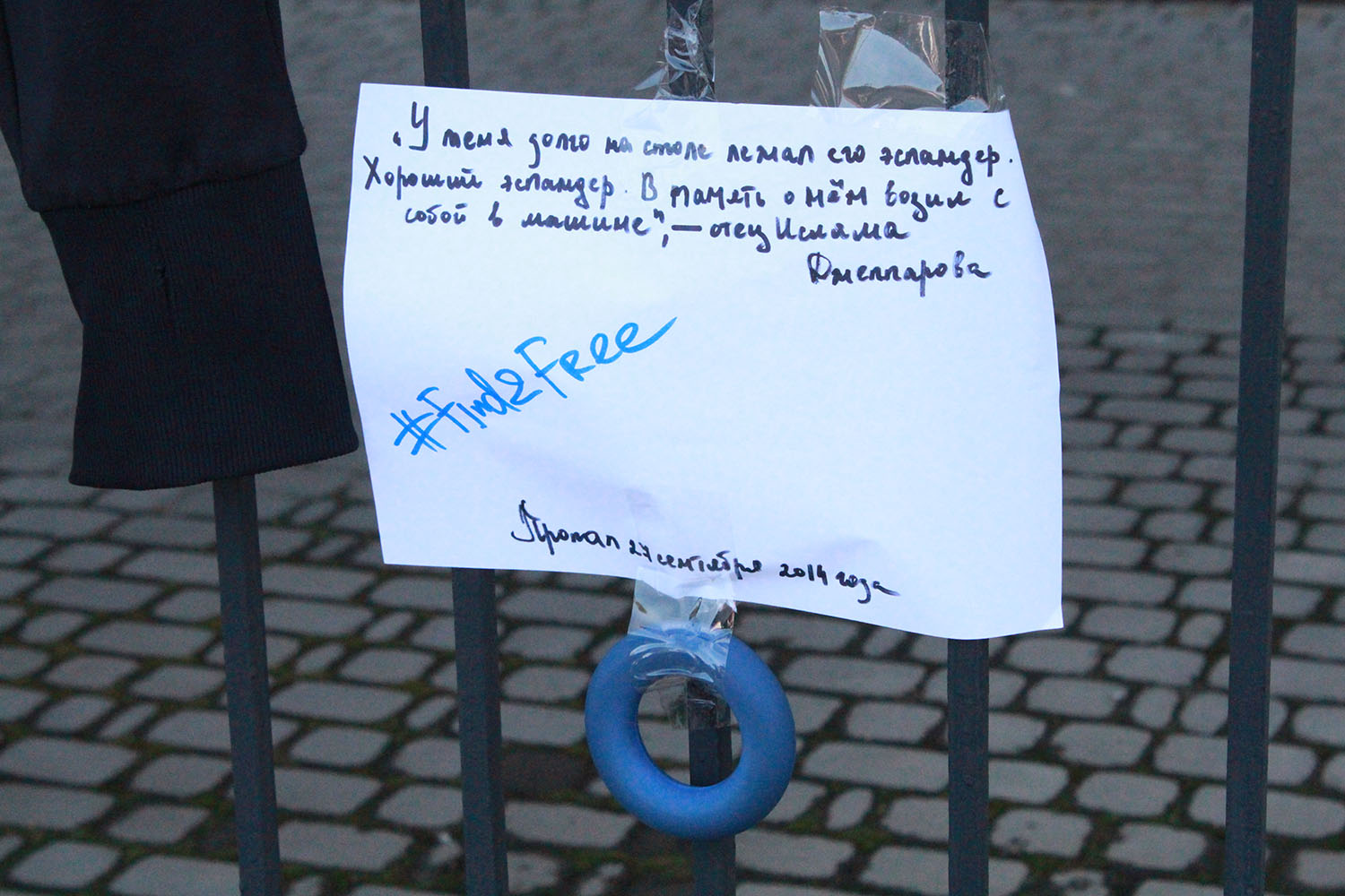 Главным акцентом этой акции стали мяч, кроссовки, виноград, гитара и одежда, которыми активисты украсили ворота посольства страны-агрессора. Как рассказала организатор, это не личные вещи людей, которых похитили. Но это те вещи, которые напоминают их родителям о своих детях.