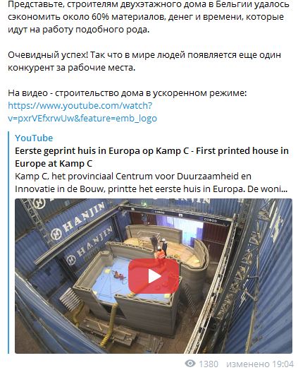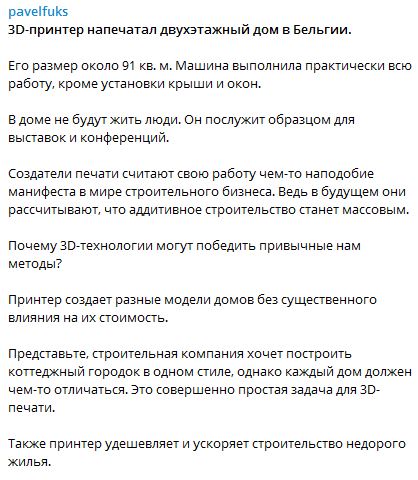Фукс заявил, что 3D-печать - это будущее строительного бизнеса. За иллюстрацию к своему сообщению, опубликованному в его Телеграм-канале 22 июля, бизнесмен взял видео, на котором в ускоренной съемке показали строительство дома при помощи 3D –принтера. "Его размер около 91 кв. м. Машина выполнила практически всю работу, кроме установки крыши и окон", - пишет Фукс в комментарии к видео.