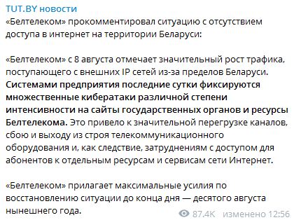"Белтелеком" с 8 августа отмечает значительный рост трафика, поступающего с внешних IP сетей из-за пределов Беларуси. Системами предприятия последние сутки фиксируются множественные кибератаки различной степени интенсивности на сайты государственных органов и ресурсы Белтелекома. Это привело к значительной перегрузке каналов, сбою и выходу из строя телекоммуникационного оборудования и, как следствие, затруднениям с доступом для абонентов к отдельным ресурсам и сервисам сети Интернет", - говорится в сообщении компании.