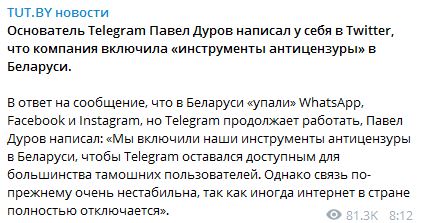 "Мы включили наши инструменты против цензуры в Беларуси, чтобы Telegram оставался доступным для большинства пользователей там. Однако связь по-прежнему очень нестабилен", - написал Дуров, отметив, что иногда интернет в стране полностью отключается, сообщает Telegram-канал TUT.BY.