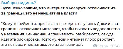 Другой Telegram-канал "Выборы видишь?" сообщил, что президент Беларуси Александр Лукашенко заявил, что интернет в Беларуси отключают из-за границы. По его словам, это не инициатива власти.