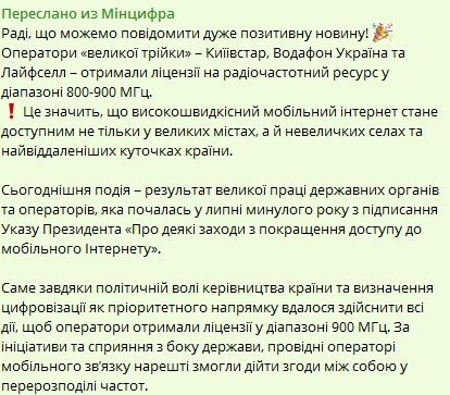 Міністерство цифрової трансформації України (Мінцифра) повідомило про нові можливості, які отримали три найбільших мобільних оператори. У відомстві заявили, що Київстар, Водафон Україна і Лайфселл отримали ліцензії на радіочастотний ресурс у діапазоні 800-900 МГц.