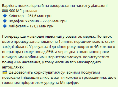 Відомство повідомило і вартість ліцензій на використання частот у діапазоні 800-900 МГц. Так, Київстару вона обійшлася в 261,6 млн грн, Водафон Україна-229,6 млн грн і Лайфселл-121,2 млн грн.