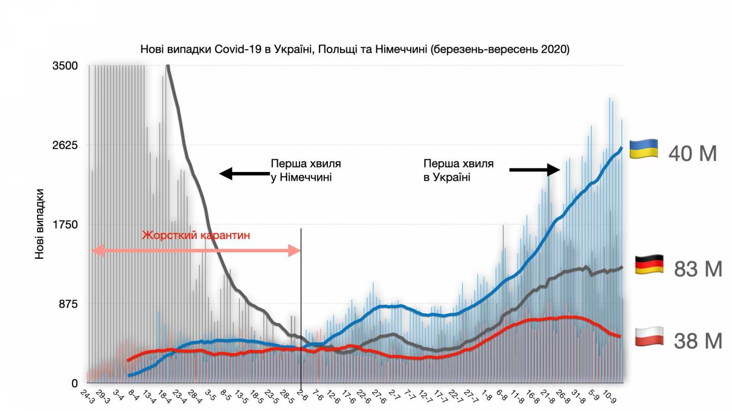 "Что такое первая волна, вы видите в левой части графика на примере Германии. Весной началось распространение, система оказалась неготова. Ответом стал карантин. Украина ввела карантин на опережение (правильно сделала). Поэтому первой волны у нас не было. Как и в Польше, например. Но карантин отложил эту волну на потом. И дал нам время подготовиться к ней", – отметил экс-чиновник.