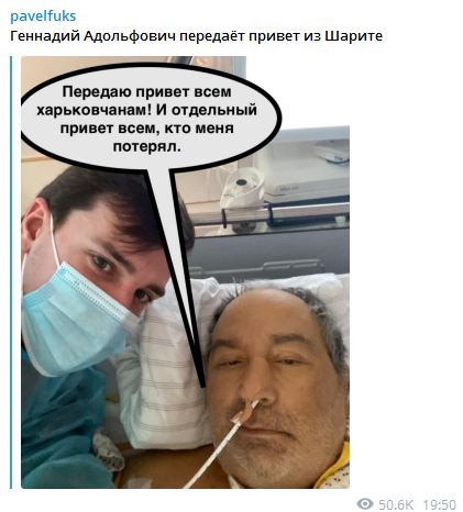 Известный меценат и бизнесмен Павел Фукс опубликовал новое фото мэра Харькова Геннадия из немецкой клиники "Шарите", где градоначальник проходит уже несколько месяцев лечение от затяжной и сложной болезни. Фото было опубликовано в Телеграм-канале бизнесмена 10 ноября.