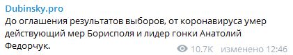 Об этом сообщил в среду, 28 октября, народный депутат от "Слуги народа" Александр Дубинский в Телеграм-канале. "До оглашения результатов выборов от коронавируса умер действующий мер Борисполя и лидер гонки Анатолий Федорчук", – поделился политик.