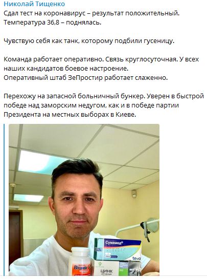 "Сдал тест на коронавирус – результат положительный. Температура 36,8 – поднялась. Чувствую себя как танк, которому подбили гусеницу. Команда работает оперативно. Связь круглосуточная. У всех наших кандидатов боевое настроение. Оперативный штаб ЗеПростір работает слаженно. Перехожу на запасной больничный бункер. Уверен в быстрой победе над заморским недугом, как и в победе партии Президента на местных выборах в Киеве", - пишет Тищенко в своем месседже подписчикам.