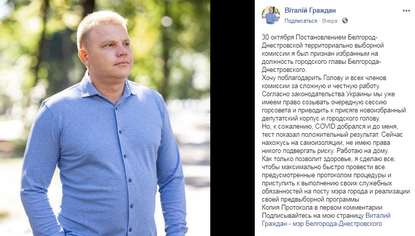 Об этом Граждан написал в Facebook в воскресенье, 1 ноября. Также чиновник сообщил, что 30 октября постановлением Белгород-Днестровской территориально выборной комиссии он был признан избранным на должность городского главы Белгорода-Днестровского.