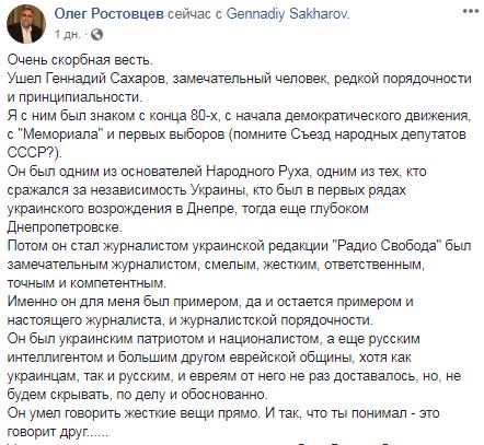 "Именно он для меня был примером, да и остается примером и настоящего журналиста, и журналистской порядочности. Он был украинским патриотом и националистом, а еще русским интеллигентом и большим другом еврейской общины, хотя как украинцам, так и русским, и евреям от него не раз доставалось, но, не будем скрывать, по делу и обоснованно. Он умел говорить жесткие вещи прямо", написал в своей публикации Олег Ростовцев.